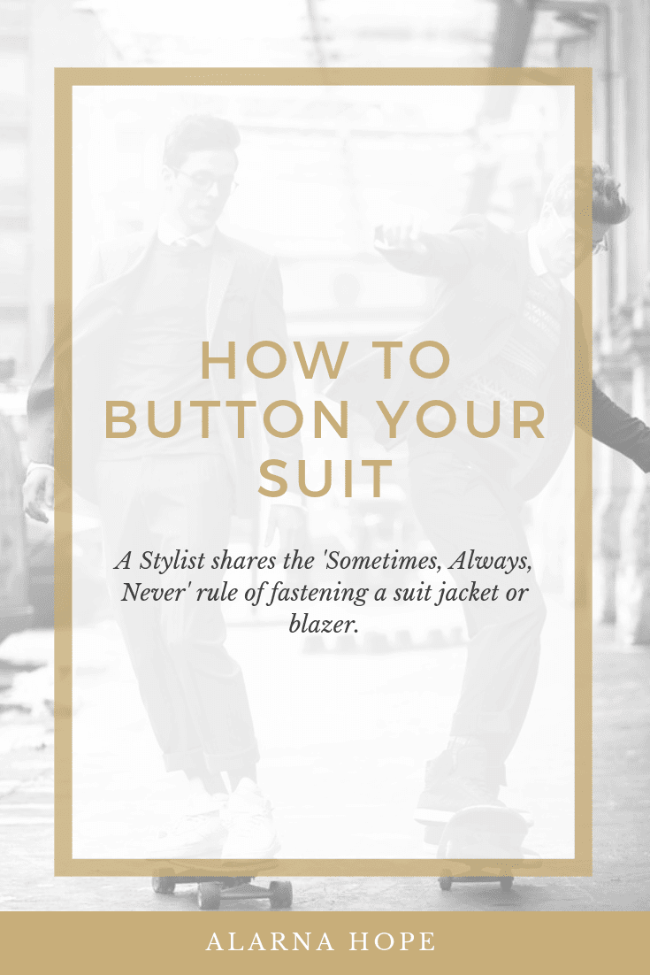 When wearing suits and jackets that are single breasted (this just means it has one column of buttons in the centre of your jacket), the Sometimes, Always, Never rule can apply to the way you button your suit.